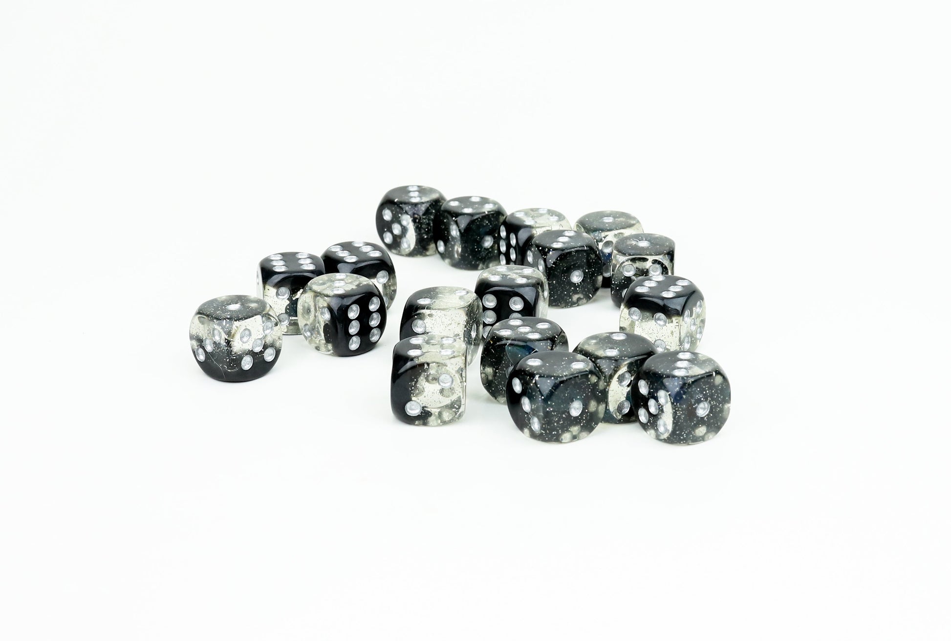 Get ready to deal out some style at your next game night! This Sirius Dice 12mm Spades D6 Dice Set is a sleek and striking addition to any collection. You'll get eighteen (18) D6 dice, each crafted from mesmerizing layers of glittering clear and deep black resin.