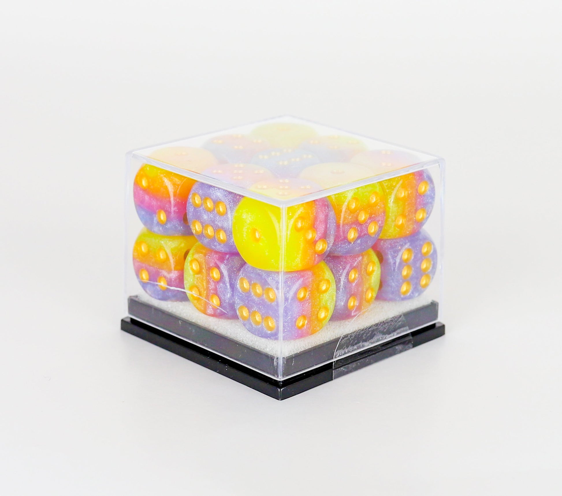 Every die sparkles with light-catching glitter, perfectly capturing the breathtaking beauty of a sunset over the ocean. These 12mm dice are a fantastic way to add a pop of color and a touch of tropical magic to your favorite board games, RPGs, or dice collection. Get ready to roll in paradise!