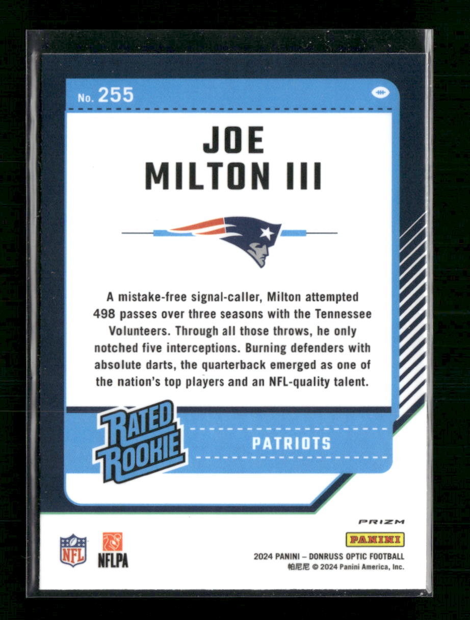 Joe Milton III New England Patriots #255 2024 Donruss Optic Rated Rookie