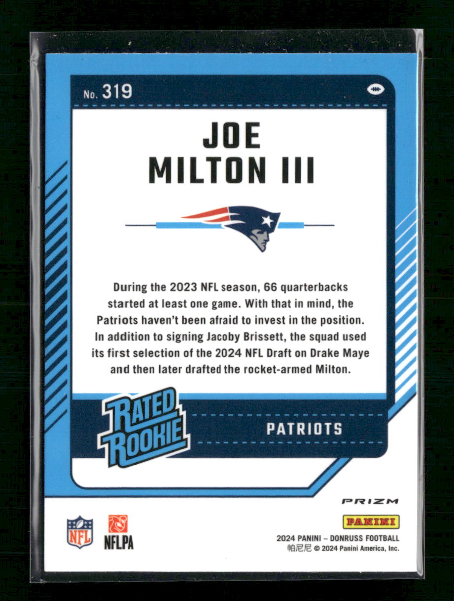 Joe Milton III New England Patriots #319 2024 Donruss Optic Rated Rookie