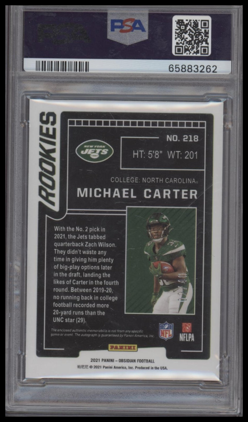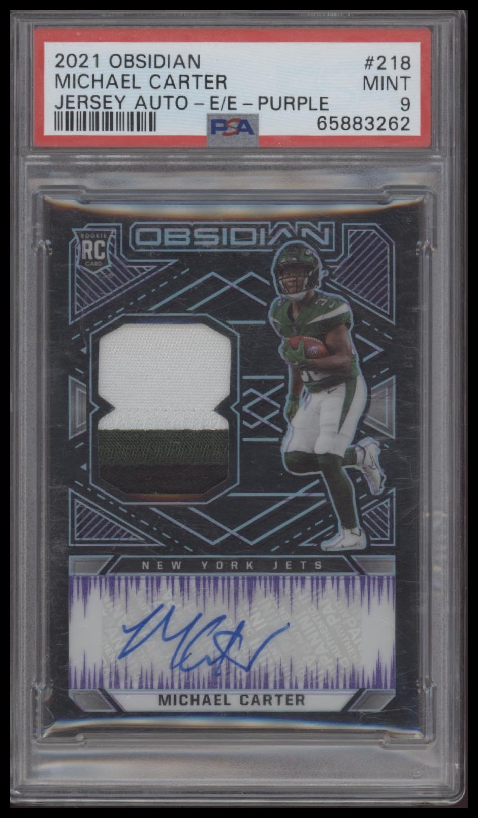 Michael Carter 2021 Panini Obsidian #218 Jersey Auto-E/E-Purple PSA 9