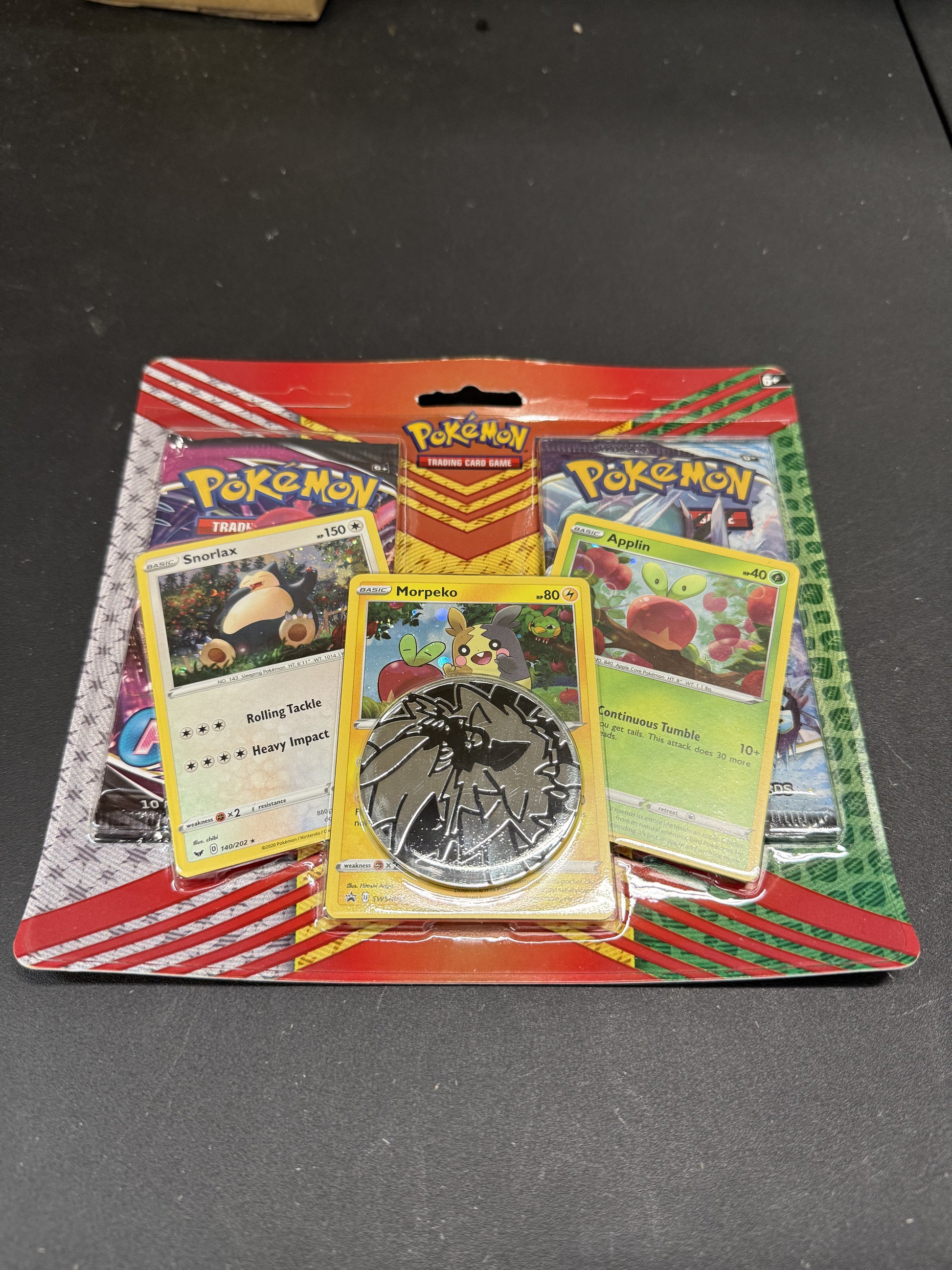 Comes with Morpeko promo card alongside Snorlax & Applin cards and coin.