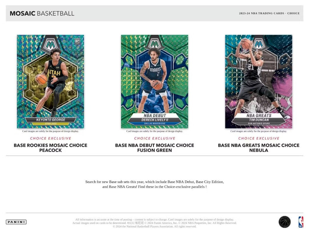收藏家可以追逐各种 Base 平行品,包括 Choice 独家 Mosaic Choice Fusion 红色和黄色 (#'d /75)、Mosaic Choice Fusion 绿色 (#'d /18)、Mosaic Choice 黑金 (#'d /8)。Mosaic Choice 星云 (#'d /1) 和短版 Mosaic Choice 孔雀!