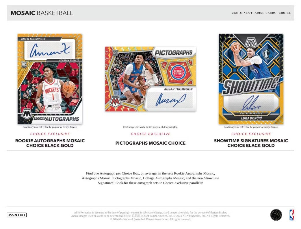 在亲笔签名马赛克、新秀亲笔签名马赛克、象形文字马赛克、拼贴亲笔签名马赛克以及今年新推出的 Showtime 签名中,您可以找到顶级 NBA 球星和新秀的亲笔签名!在 Choice-Exclusive 平行版 Choice 和 Choice Black Gold (#'d /8) 中可以找到这些!