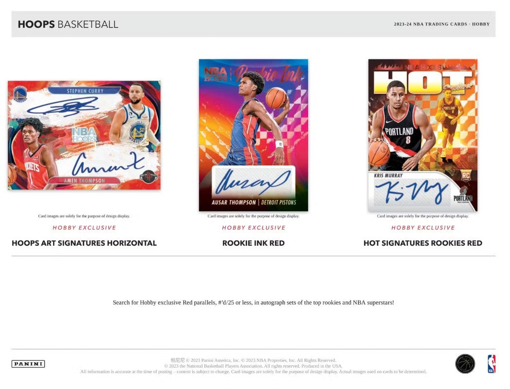 HOOPS ART 签名 / ROOKIE INK / HOT 签名 ROOKIES: 在顶级新秀和 NBA 巨星的签名套装中搜索 Hobby 独有的红色平行卡,编号为 /25 或更少!