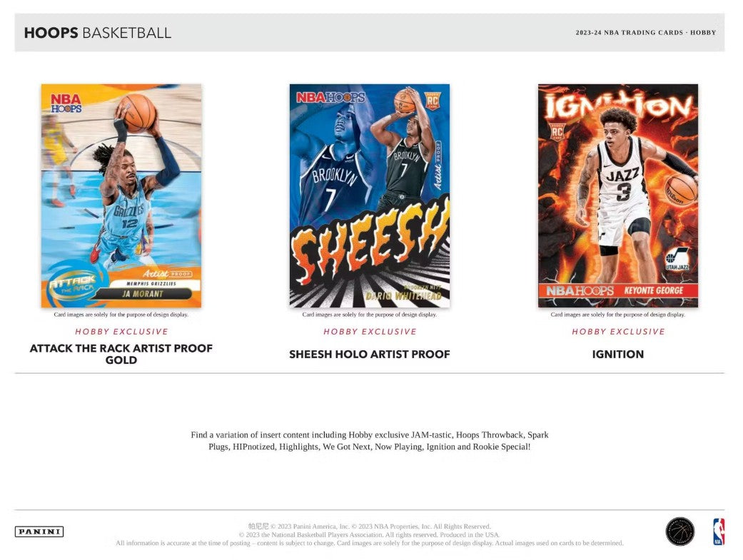 攻击 RACK 艺术家证明 / SHEESH HOLO 艺术家证明 / 点火: 查找插入内容的变化,包括爱好独有的 JAM-tastic、Hoops Throwback、Spark Plugs、HIPnotized、Highlights、We Got Next、Now Playing、Ignition 和 Rookie Special!