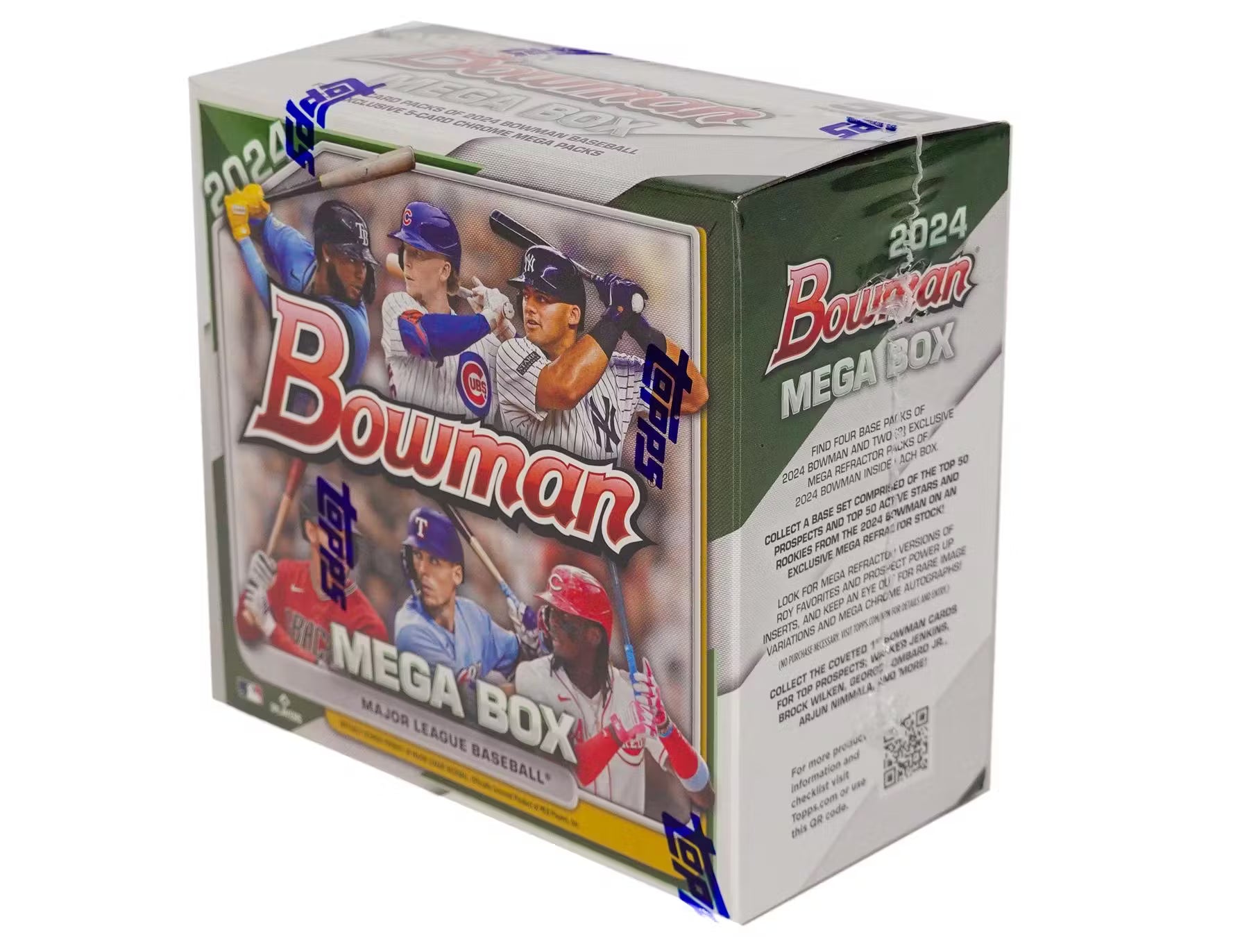 Look for (4) 2024 Bowman Baseball packs and (2) exclusive Mega Chrome packs per Mega Box!