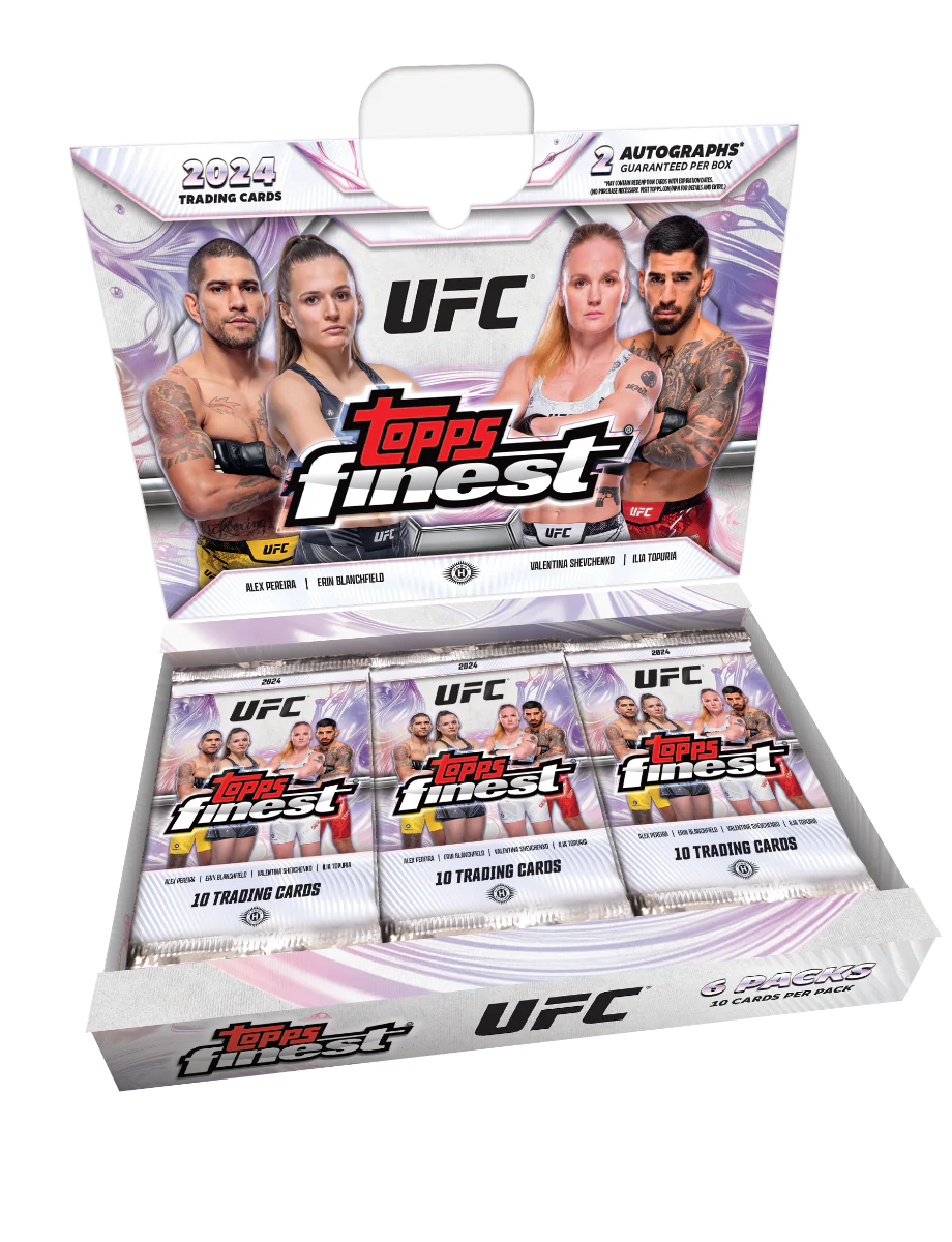 This box is the headline release for UFC collectors in 2024, featuring two guaranteed autographs per hobby box—a significant draw for those seeking high-value cards. The set boasts a massive 300-card checklist, divided into Common, Uncommon, and Rare tiers, with a rainbow of color and tech parallels that appeal to both set builders and hit chasers.