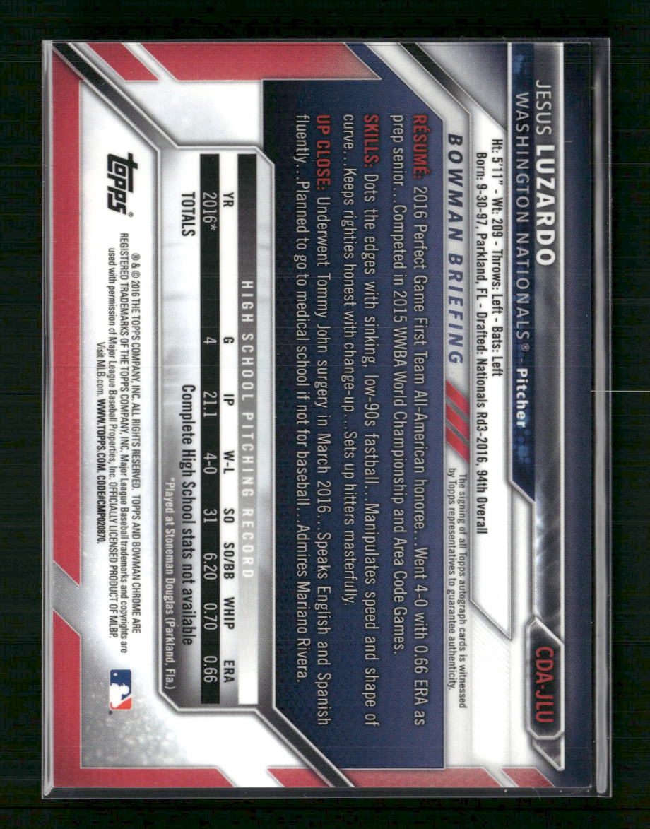 Jesus Luzardo 2016 #CDA-JLU Bowman Draft Auto